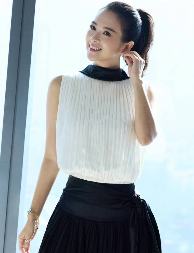 章子怡穿白色无袖上衣搭配黑色短裙,青春元气似少女。